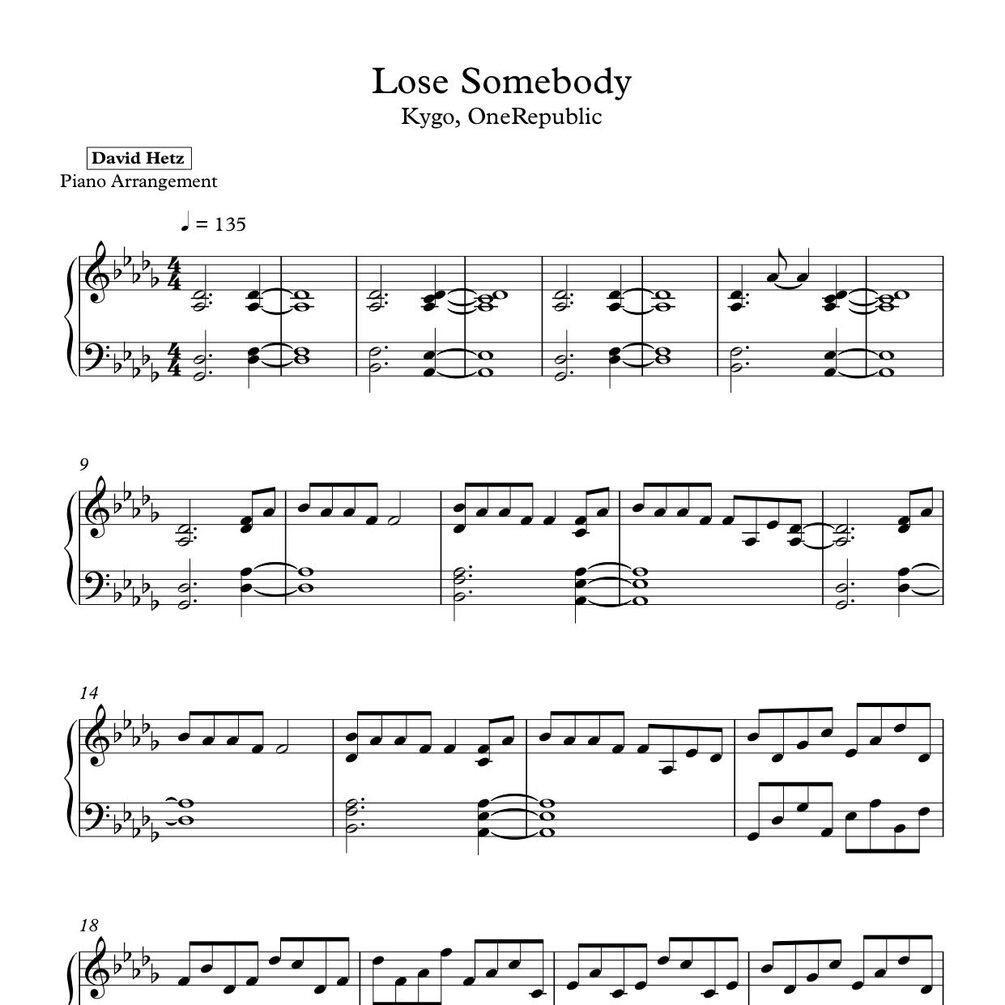 Kygo, One Republic - Lose Somebody | David Hetz Piano Sheet Music