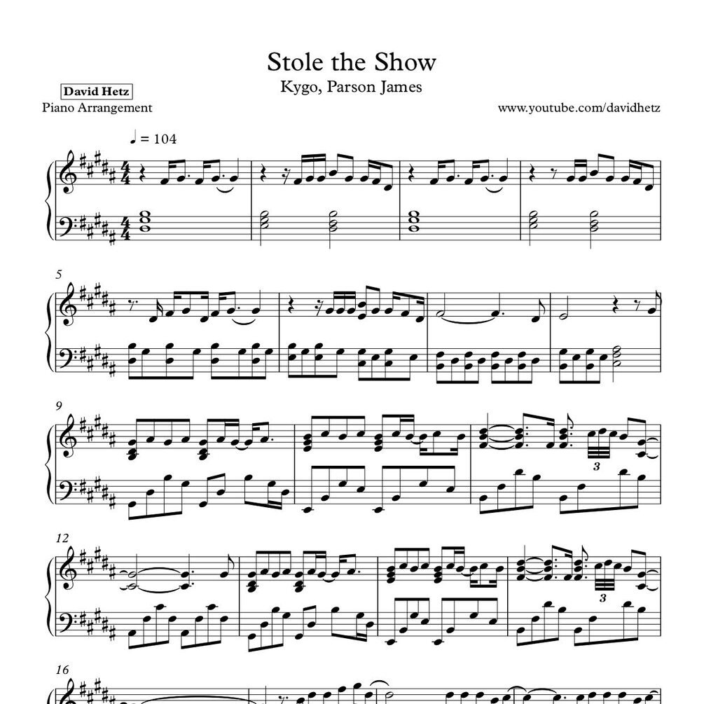 Kygo, Parson James - Stole The Show | David Hetz Piano Sheet Music
